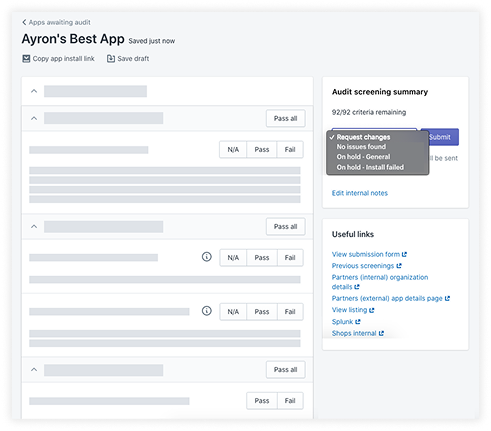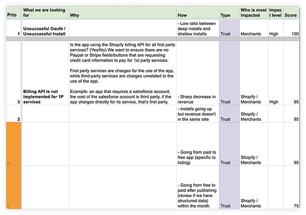 Because Shopify doesn’t host third-party apps, approved apps effectively went dark after launch; leaving us blind to behavior changes, infractions, and trust-breaking issues until merchants complained. I designed a prioritization process using indirect data tripwires to surface risky live apps early, establishing a consistent quality bar, discouraging bad actors, clarifying ecosystem-wide non-compliance, and creating a fast, repeatable way to address issues at scale.